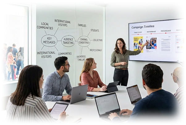 Cultural Project Managers collaborate closely with communication, press, and digital teams to define project narratives. This involves: